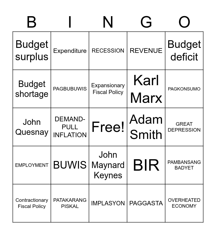 This bingo card has a free space and 24 words: BUWIS, PATAKARANG PISKAL, Expansionary Fiscal Policy, Contractionary Fiscal Policy, Budget deficit, Budget surplus, Budget shortage, Expenditure, Adam Smith, John Maynard Keynes, Karl Marx, John Quesnay, BIR, PAMBANSANG BADYET, PAGBUBUWIS, PAGGASTA, GREAT DEPRESSION, RECESSION, PAGKONSUMO, DEMAND-PULL INFLATION, OVERHEATED ECONOMY, EMPLOYMENT, REVENUE and IMPLASYON.