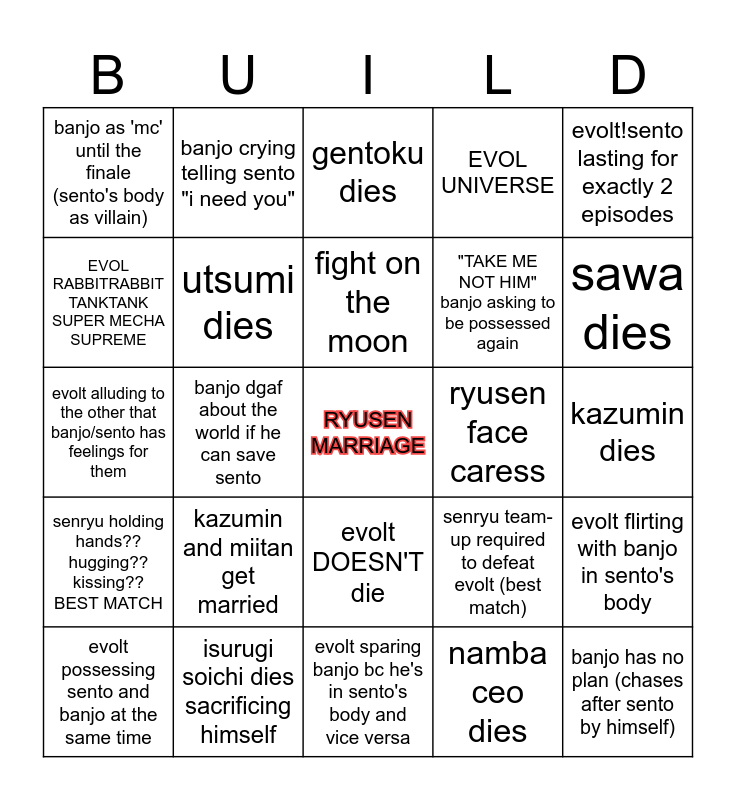 This bingo card has a free space and 24 words: kazumin and miitan get married, isurugi soichi dies sacrificing himself, fight on the moon, evolt possessing sento and banjo at the same time, evolt!sento lasting for exactly 2 episodes, banjo as 'mc' until the finale (sento's body as villain), EVOL RABBITRABBIT TANKTANK SUPER MECHA SUPREME, banjo crying telling sento "i need you", ryusen face caress, evolt DOESN'T die, "TAKE ME NOT HIM" banjo asking to be possessed again, evolt alluding to the other that banjo/sento has feelings for them, senryu team-up required to defeat evolt (best match), evolt flirting with banjo in sento's body, utsumi dies, namba ceo dies, kazumin dies, gentoku dies, sawa dies, banjo dgaf about the world if he can save sento, banjo has no plan (chases after sento by himself), senryu holding hands?? hugging?? kissing?? BEST MATCH, EVOL UNIVERSE and evolt sparing banjo bc he's in sento's body and vice versa.