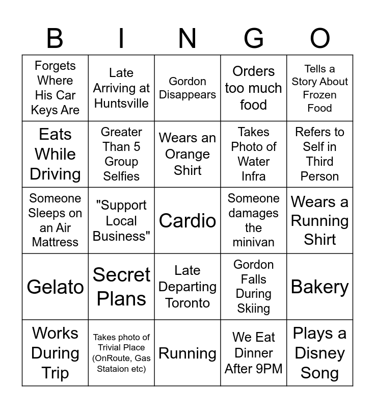 This bingo card has a free space and 24 words: Secret Plans, Takes photo of Trivial Place (OnRoute, Gas Stataion etc), Wears an Orange Shirt, Works During Trip, Tells a Story About Frozen Food, Forgets Where His Car Keys Are, Eats While Driving, Late Arriving at Huntsville, Someone damages the minivan, Late Departing Toronto, Takes Photo of Water Infra, Someone Sleeps on an Air Mattress, Gordon Falls During Skiing, Bakery, Greater Than 5 Group Selfies, We Eat Dinner After 9PM, Wears a Running Shirt, Gordon Disappears, Refers to Self in Third Person, "Support Local Business", Plays a Disney Song, Gelato, Orders too much food and Running.