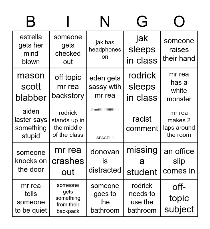 This bingo card has a free space and 24 words: mr rea crashes out, someone gets something from their backpack, eden gets sassy wtih mr rea, mr rea tells someone to be quiet, someone raises their hand, estrella gets her mind blown, mason scott blabber, someone gets checked out, racist comment, donovan is distracted, rodrick sleeps in class, aiden laster says something stupid, missing a student, an office slip comes in, off topic mr rea backstory, rodrick needs to use the bathroom, mr rea makes 2 laps around the room, jak has headphones on, mr rea has a white monster, rodrick stands up in the middle of the class, off-topic subject, someone knocks on the door, jak sleeps in class and someone goes to the bathroom.