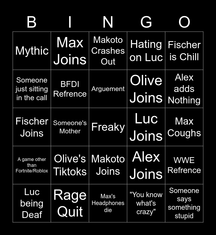 This bingo card has a free space and 24 words: Olive's Tiktoks, Rage Quit, Arguement, Luc being Deaf, Fischer is Chill, Mythic, Someone just sitting in the call, Max Joins, Luc Joins, Makoto Joins, Olive Joins, Fischer Joins, Alex Joins, WWE Refrence, BFDI Refrence, "You know what's crazy", Max Coughs, Makoto Crashes Out, Alex adds Nothing, Someone's Mother, Someone says something stupid, A game other than Fortnite/Roblox, Hating on Luc and Max's Headphones die.