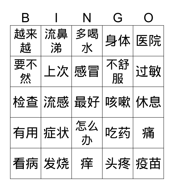 This bingo card has a free space and 24 words: 症状, 发烧, 感冒, 看病, 医院, 越来越, 要不然, 流鼻涕, 咳嗽, 怎么办, 不舒服, 检查, 吃药, 痛, 上次, 头疼, 休息, 多喝水, 过敏, 流感, 疫苗, 有用, 身体 and 痒.