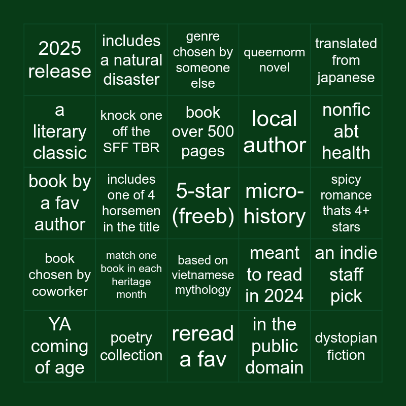 This bingo card has a free space and 24 words: match one book in each heritage month, poetry collection, book over 500 pages, YA coming of age, translated from japanese, 2025 release, a literary classic, includes a natural disaster, micro-history, based on vietnamese mythology, local author, book by a fav author, meant to read in 2024, an indie staff pick, knock one off the SFF TBR, in the public domain, spicy romance thats 4+ stars, genre chosen by someone else, nonfic abt health, includes one of 4 horsemen in the title, dystopian fiction, book chosen by coworker, queernorm novel and reread a fav.