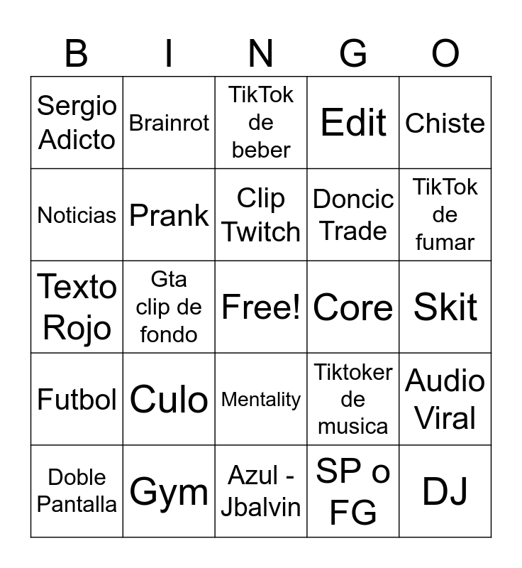 This bingo card has a free space and 24 words: Culo, Gym, Clip Twitch, Doble Pantalla, Chiste, Sergio Adicto, Noticias, Brainrot, Core, Mentality, Doncic Trade, Texto Rojo, Tiktoker de musica, Audio Viral, Prank, SP o FG, Skit, TikTok de beber, TikTok de fumar, Gta clip de fondo, DJ, Futbol, Edit and Azul - Jbalvin.