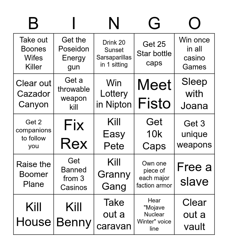 This bingo card has a free space and 24 words: Get Banned from 3 Casinos, Kill Benny, Win Lottery in Nipton, Kill House, Win once in all casino Games, Take out Boones Wifes Killer, Clear out Cazador Canyon, Get the Poseidon Energy gun, Get 10k Caps, Kill Granny Gang, Meet Fisto, Get 2 companions to follow you, Own one piece of each major faction armor, Free a slave, Get a throwable weapon kill, Hear "Mojave Nuclear Winter" voice line, Get 3 unique weapons, Drink 20 Sunset Sarsaparillas in 1 sitting, Sleep with Joana, Fix Rex, Clear out a vault, Raise the Boomer Plane, Get 25 Star bottle caps and Take out a caravan.