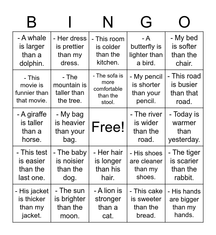 This bingo card has a free space and 30 words: - The sun is brighter than the moon., - A cheetah is faster than a turtle., - My bag is heavier than your bag., - This book is thicker than that book., - A whale is larger than a dolphin., - This room is colder than the kitchen., - The mountain is taller than the tree., - Her hair is longer than his hair., - The river is wider than the road., - A lion is stronger than a cat., - Today is warmer than yesterday., - His hands are bigger than my hands., - This cake is sweeter than the bread., - My grandma is older than my mom., - This road is busier than that road., - The coffee is hotter than the tea., - His shoes are cleaner than my shoes., - This test is easier than the last one., - The baby is noisier than the dog., - My bed is softer than the chair., - A giraffe is taller than a horse., - The lake is deeper than the pool., - Her dress is prettier than my dress., - My pencil is shorter than your pencil., - This movie is funnier than that movie., - A butterfly is lighter than a bird., - The tiger is scarier than the rabbit., - His jacket is thicker than my jacket., - The sofa is more comfortable than the stool. and - The street is darker than the park..