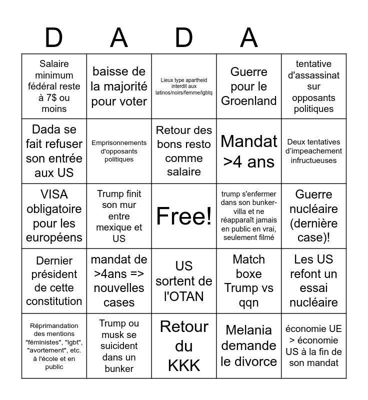 This bingo card has a free space and 33 words: Trump et Musk sont plus copains et se tapent sur la gueule, Musk lance un coup d’état, Trump finit son mur entre mexique et US, 1chf=2$, Dernier président de cette constitution, Emprisonnements d'opposants politiques, tentative d'assassinat sur opposants politiques, Réprimandation des mentions "féministes", "lgbt", "avortement", etc. à l'école et en public, baisse de la majorité pour voter, baisse de l'âge légal de fin d'école obligatoire, Retour des bons resto comme salaire, Lieux type apartheid interdit aux latinos/noirs/femme/lgbtq, Les us redeviennent un giga paradis fiscal, Une nouvelle golden shower de trump, trump s'enfermer dans son bunker-villa et ne réapparaît jamais en public en vrai, seulement filmé, Deux tentatives d’impeachement infructueuses, Trump ou musk se suicident dans un bunker, VISA obligatoire pour les européens, mandat de >4ans => nouvelles cases, Match boxe Trump vs qqn, US sortent de l'OTAN, Déportation annulée, ils acceptent des gens, Salaire minimum fédéral reste à 7$ ou moins, Guerre nucléaire (dernière case)!, Retour du KKK, économie UE > économie US à la fin de son mandat, Guerre pour le Groenland, Mandat >4 ans, Dada se fait refuser son entrée aux US, Les US refont un essai nucléaire, Trump meurt avant la fin de son mandat, Melania demande le divorce and Musk est candidat aux présidentielles dans 4 ans.