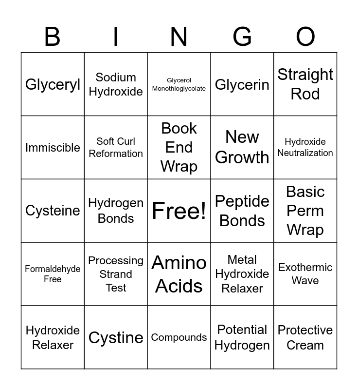 This bingo card has a free space and 90 words: Acid Balanced Waves, Alkaline Waves, Amino Acids, Ammonia, Aldehyde, Ammonium Bisulfite Relaxer, Ammonia Free Waves, Ammonium Thioglycolate, Base Control, Base Cream, Base Direction, Base Relaxer, Base sections, Basic Perm Wrap, Bender Rod, Book End Wrap, Bricklay Perm Wrap, Chemical Properties, Chemical Change, Curvature Perm Wrap, Croquignole Wrap, Concave Rod, Compounds, Chemical Relaxing, Cysteine, Cystine, Disulfide Bonds, Double Flat Wrap, Elasticity, End Papers, Endothermic Wave, Exothermic Wave, Formaldehyde, Formaldehyde Free, Glyceryl, Glycerin, Glycerol Monothioglycolate, Guanidine Hydroxide, Hydrogen Bonds, Hydroxide Neutralization, Hydroxide Relaxer, Immiscible, Keratin, Lanthionization, Loop Rod, Metal Hydroxide Relaxer, Matter, Miscible, Neutralizer, Neutralizing, Neutralizing Shampoo, New Growth, No Base Relaxer, Normalizing Lotion, Occupational Disease, Partial Perm Wrap, Peptide Bonds, Perimeter Definition, Permanent Waving, PH Scale, Physical Change, Physical Mixtures, Physical Properties, Piggyback Perm Wrap, Polypeptide Chain, Porosity, Potassium Hydroxide & Lithium Hydroxide, Potential Hydrogen, Preliminary Strand Test, Preliminary Test Curl, Processing Strand Test, Protective Cream, Single Flat Wrap, Sodium, Sodium Hydroxide, Soft Curl Reformation, Solute, Solution, Solvent, Spiral Wrap, Sponge Rod, Straight Rod, Suspension, Thioglycolic Acid, Thio Neutralization, Thioglycolic Relaxers, True Acid Waves, Viscosity, Weave Perm Wrap and Trichology.