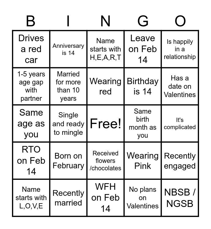 This bingo card has a free space and 24 words: Born on February, Recently married, Wearing red, Name starts with L,O,V,E, Is happily in a relationship, Drives a red car, 1-5 years age gap with partner, Anniversary is 14, Same birth month as you, Received flowers /chocolates, Birthday is 14, Same age as you, Wearing Pink, Recently engaged, Married for more than 10 years, No plans on Valentines, It's complicated, Name starts with H,E,A,R,T, Has a date on Valentines, Single and ready to mingle, NBSB / NGSB, RTO on Feb 14, Leave on Feb 14 and WFH on Feb 14.