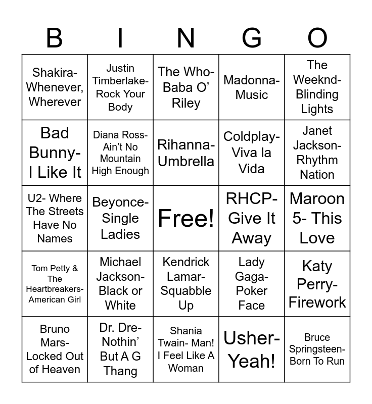 This bingo card has a free space and 26 words: Kendrick Lamar- Squabble Up, Usher- Yeah!, Rihanna- Umbrella, Dr. Dre- Nothin’ But A G Thang, The Weeknd- Blinding Lights, Shakira- Whenever, Wherever, Bad Bunny- I Like It, Justin Timberlake- Rock Your Body, Maroon 5- This Love, Lady Gaga- Poker Face, Coldplay- Viva la Vida, U2- Where The Streets Have No Names, Katy Perry- Firework, Bruno Mars- Locked Out of Heaven, Beyonce- Single Ladies, Prince- Let’s Go Crazy, Madonna- Music, Tom Petty & The Heartbreakers- American Girl, The Who- Baba O’ Riley, Bruce Springsteen- Born To Run, Janet Jackson- Rhythm Nation, Shania Twain- Man! I Feel Like A Woman, RHCP- Give It Away, Michael Jackson- Black or White, Diana Ross- Ain’t No Mountain High Enough and Paul McCartney- Live and Let Die.