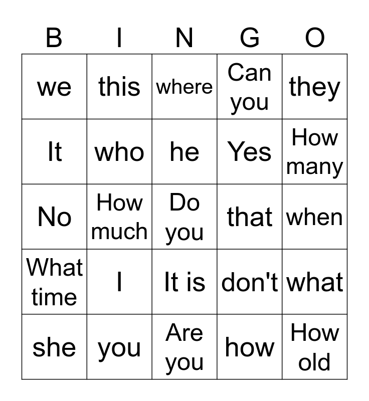This bingo card has a free space and 24 words: I, you, he, she, they, we, It, this, that, It is, Yes, No, don't, what, who, how, when, where, How many, How much, How old, What time, Can you and Are you.