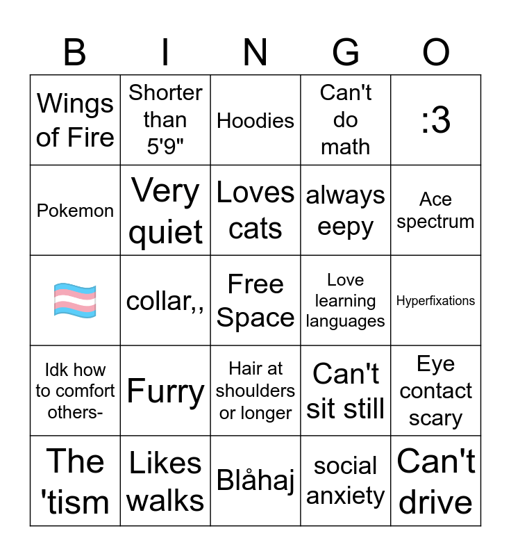 This bingo card has a free space and 24 words: The 'tism, Furry, Loves cats, social anxiety, :3, Wings of Fire, Shorter than 5'9", Hoodies, Love learning languages, Hyperfixations, 🏳️⚧️, Very quiet, Can't sit still, Eye contact scary, Pokemon, Likes walks, Blåhaj, Can't do math, Ace spectrum, Idk how to comfort others-, collar,,, Hair at shoulders or longer, always eepy and Can't drive.