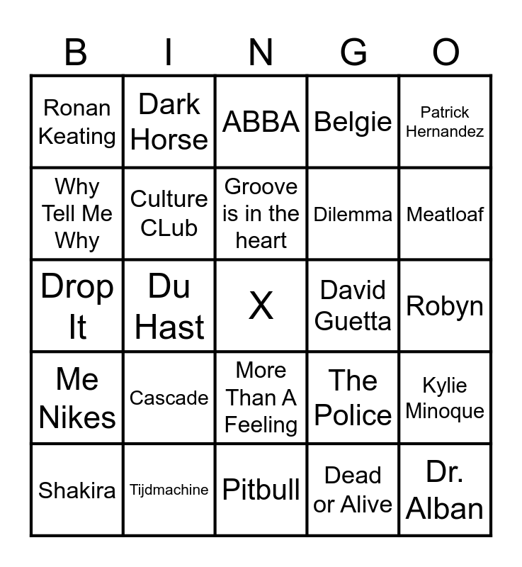 This bingo card has a free space and 76 words: Cosmis gate, Black Eyed Peas, ABBA, Walk on water, John West, Blue Monday, Show me love, Marco Schuitemaker, Maria (I Like It Loud), Pepas, Believe, Tubthumping, Groove is in the heart, Why Tell Me Why, Helene Fischer, Du Hast, Beastie Boys, Dr. Alban, Village People, Patrick Hernandez, Schultenbrau, Drop It, Culture CLub, Dark Horse, Belgie, Guillermo en Tropical Danny, Jason Derulo, Total Eclipse Of The Heart, APT., Angels, Rene Karst en Stef Ekkel, Fields of Gold, Simply Red, The Police, Meatloaf, Dilemma, De Jeugd van Tegenwoordig, C&C Music Factory, Robyn, Dead or Alive, Harder dan ik hebben kan, J Balvin, Gemengde Signalen, Just A Girl, Careless Whisper, (It Goes Like) Nanana, Shakira, Ronan Keating, Sugababes, Atomic Kitten, Nicki Minaj, More Than A Feeling, Fred Again, Leuk, Flemming, Dynamite, Turn Down For What, Sean Paul, Lil Kim, Ultimate Kaos, Cascade, Wonderfull Days, The Darkness, Panjabi MC, Everybody, Journey, David Guetta, Conga!, Scream & Shout, Bryan Adams, Kylie Minoque, Me Nikes, Tijdmachine, Zandloper, Pitbull and Maniac.