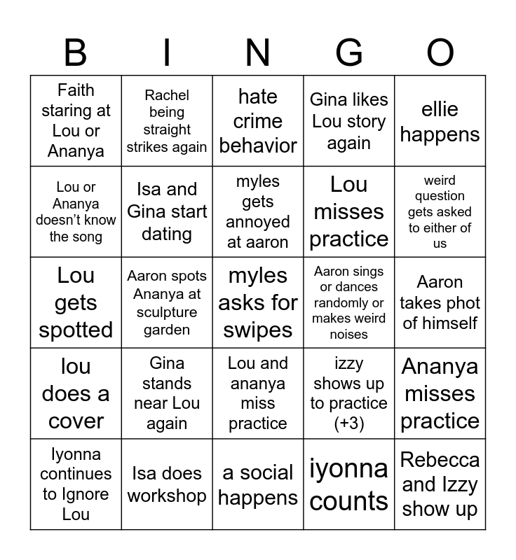 This bingo card has a free space and 25 words: Iyonna continues to Ignore Lou, Gina stands near Lou again, myles gets annoyed at aaron, iyonna counts, weird question gets asked to either of us, Faith staring at Lou or Ananya, Rachel being straight strikes again, hate crime behavior, Lou misses practice, Ananya misses practice, Lou gets spotted, Isa and Gina start dating, izzy shows up to practice (+3), Rebecca and Izzy show up, Lou or Ananya doesnβt know the song, Isa does workshop, a social happens, Gina likes Lou story again, Aaron takes phot of himself, lou does a cover, Aaron spots Ananya at sculpture garden, Lou and ananya miss practice, Aaron sings or dances randomly or makes weird noises, ellie happens and iβm.