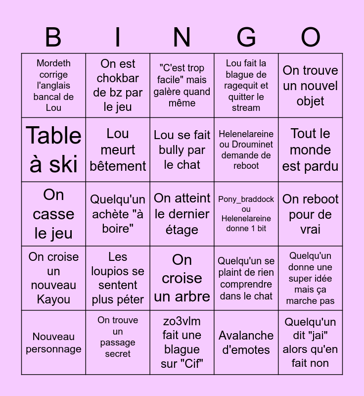 This bingo card has 25 words: On croise un nouveau Kayou, On trouve un passage secret, On atteint le dernier étage, Avalanche d'emotes, On trouve un nouvel objet, Mordeth corrige l'anglais bancal de Lou, On est chokbar de bz par le jeu, "C'est trop facile" mais galère quand même, Pony_braddock ou Helenelareine donne 1 bit, Quelqu'un donne une super idée mais ça marche pas, Table à ski, Lou meurt bêtement, zo3vlm fait une blague sur "Cif", Quelqu'un se plaint de rien comprendre dans le chat, Tout le monde est pardu, Nouveau personnage, Quelqu'un achète "à boire", Lou se fait bully par le chat, Helenelareine ou Drouminet demande de reboot, On reboot pour de vrai, On casse le jeu, Les loupios se sentent plus péter, On croise un arbre, Lou fait la blague de ragequit et quitter le stream and Quelqu'un dit "jai" alors qu'en fait non.