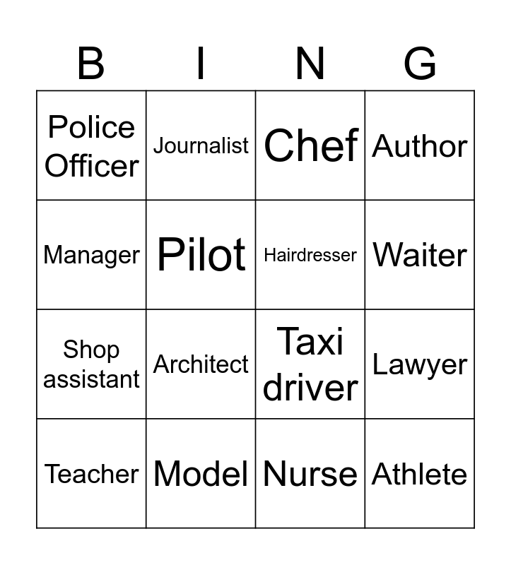 This bingo card has 16 words: Model, Lawyer, Chef, Police Officer, Shop assistant, Journalist, Taxi driver, Nurse, Manager, Pilot, Teacher, Author, Architect, Waiter, Hairdresser and Athlete.