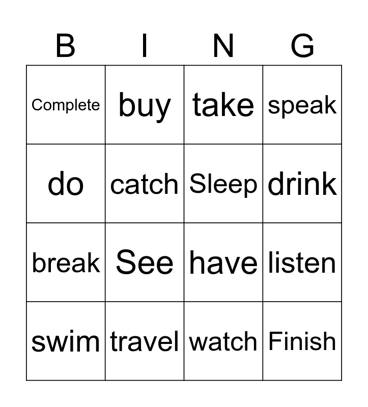 This bingo card has 16 words: swim, travel, take, speak, do, buy, have, listen, Complete, catch, watch, drink, break, See, Sleep and Finish.