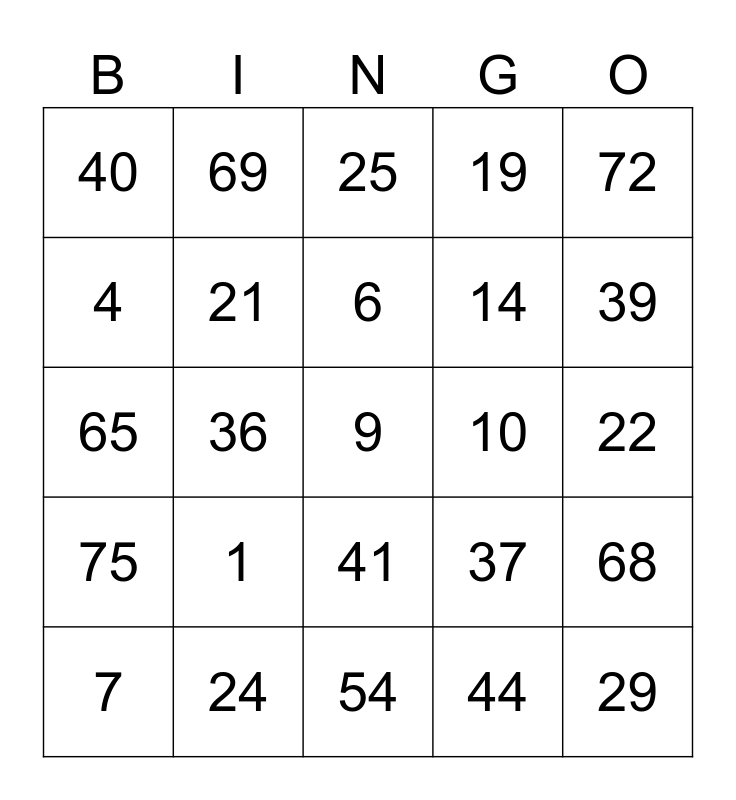 This bingo card has a free space and 24 words: 1, 24, 6, 7, 72, 40, 4, 69, 10, 41, 14, 65, 37, 68, 21, 44, 22, 25, 39, 36, 29, 75, 19 and 54.