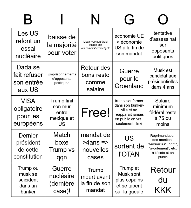 This bingo card has a free space and 32 words: Trump et Musk sont plus copains et se tapent sur la gueule, Musk lance un coup d’état, Trump finit son mur entre mexique et US, 1chf=2$, Dernier président de cette constitution, Emprisonnements d'opposants politiques, tentative d'assassinat sur opposants politiques, Réprimandation des mentions "féministes", "lgbt", "avortement", etc. à l'école et en public, baisse de la majorité pour voter, baisse de l'âge légal de fin d'école obligatoire, Retour des bons resto comme salaire, Lieux type apartheid interdit aux latinos/noirs/femme/lgbtq, Les us redeviennent un giga paradis fiscal, Une nouvelle golden shower de trump, trump s'enfermer dans son bunker-villa et ne réapparaît jamais en public en vrai, seulement filmé, Deux tentatives d’impeachement infructueuses, Trump ou musk se suicident dans un bunker, VISA obligatoire pour les européens, mandat de >4ans => nouvelles cases, Match boxe Trump vs qqn, US sortent de l'OTAN, Déportation annulée, ils acceptent des gens, Salaire minimum fédéral reste à 7$ ou moins, Guerre nucléaire (dernière case)!, Retour du KKK, économie UE > économie US à la fin de son mandat, Guerre pour le Groenland, Dada se fait refuser son entrée aux US, Les US refont un essai nucléaire, Trump meurt avant la fin de son mandat, Melania demande le divorce and Musk est candidat aux présidentielles dans 4 ans.
