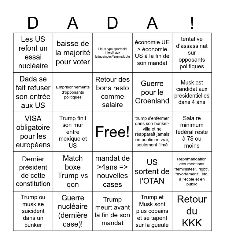 This bingo card has a free space and 32 words: Trump et Musk sont plus copains et se tapent sur la gueule, Musk lance un coup d’état, Trump finit son mur entre mexique et US, 1chf=2$, Dernier président de cette constitution, Emprisonnements d'opposants politiques, tentative d'assassinat sur opposants politiques, Réprimandation des mentions "féministes", "lgbt", "avortement", etc. à l'école et en public, baisse de la majorité pour voter, baisse de l'âge légal de fin d'école obligatoire, Retour des bons resto comme salaire, Lieux type apartheid interdit aux latinos/noirs/femme/lgbtq, Les us redeviennent un giga paradis fiscal, Une nouvelle golden shower de trump, trump s'enfermer dans son bunker-villa et ne réapparaît jamais en public en vrai, seulement filmé, Deux tentatives d’impeachement infructueuses, Trump ou musk se suicident dans un bunker, VISA obligatoire pour les européens, mandat de >4ans => nouvelles cases, Match boxe Trump vs qqn, US sortent de l'OTAN, Déportation annulée, ils acceptent des gens, Salaire minimum fédéral reste à 7$ ou moins, Guerre nucléaire (dernière case)!, Retour du KKK, économie UE > économie US à la fin de son mandat, Guerre pour le Groenland, Dada se fait refuser son entrée aux US, Les US refont un essai nucléaire, Trump meurt avant la fin de son mandat, Melania demande le divorce and Musk est candidat aux présidentielles dans 4 ans.