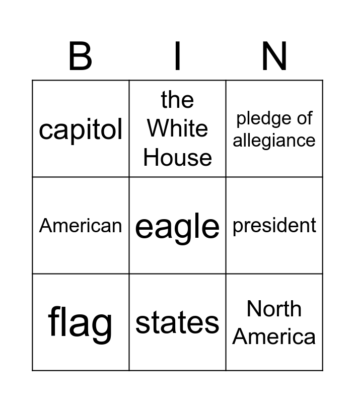 This bingo card has a free space and 8 words: president, pledge of allegiance, the White House, flag, capitol, North America, American and states.