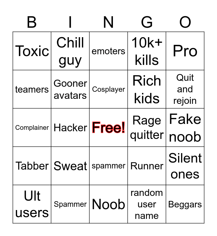 This bingo card has a free space and 24 words: Sweat, Spammer, Cosplayer, Ult users, Pro, Toxic, teamers, Chill guy, Rage quitter, spammer, Rich kids, Complainer, Runner, Silent ones, Gooner avatars, random user name, Fake noob, emoters, Quit and rejoin, Hacker, Beggars, Tabber, 10k+ kills and Noob.