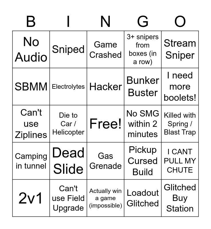 This bingo card has a free space and 24 words: Dead Slide, Can't use Field Upgrade, Hacker, 2v1, Stream Sniper, No Audio, SBMM, Sniped, No SMG within 2 minutes, Gas Grenade, Bunker Buster, Can't use Ziplines, Pickup Cursed Build, I CANT PULL MY CHUTE, Electrolytes, Loadout Glitched, Killed with Spring / Blast Trap, Game Crashed, I need more boolets!, Die to Car / Helicopter, Glitched Buy Station, Camping in tunnel, 3+ snipers from boxes (in a row) and Actually win a game (impossible).