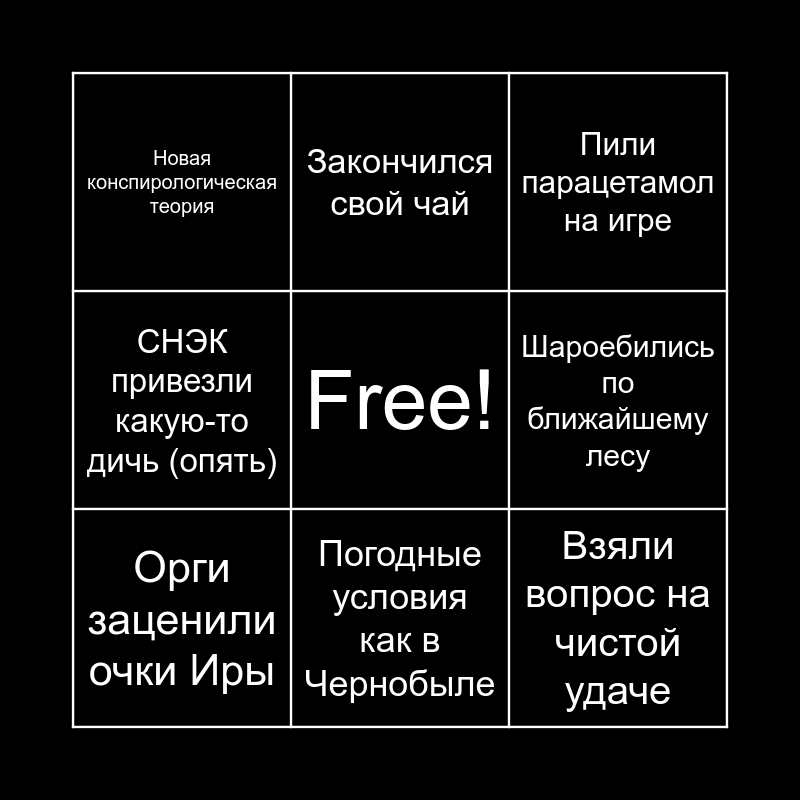 This bingo card has a free space and 8 words: Шароебились по ближайшему лесу, Пили парацетамол на игре, Закончился свой чай, Орги заценили очки Иры, Новая конспирологическая теория, Взяли вопрос на чистой удаче, СНЭК привезли какую-то дичь (опять) and Погодные условия как в Чернобыле.