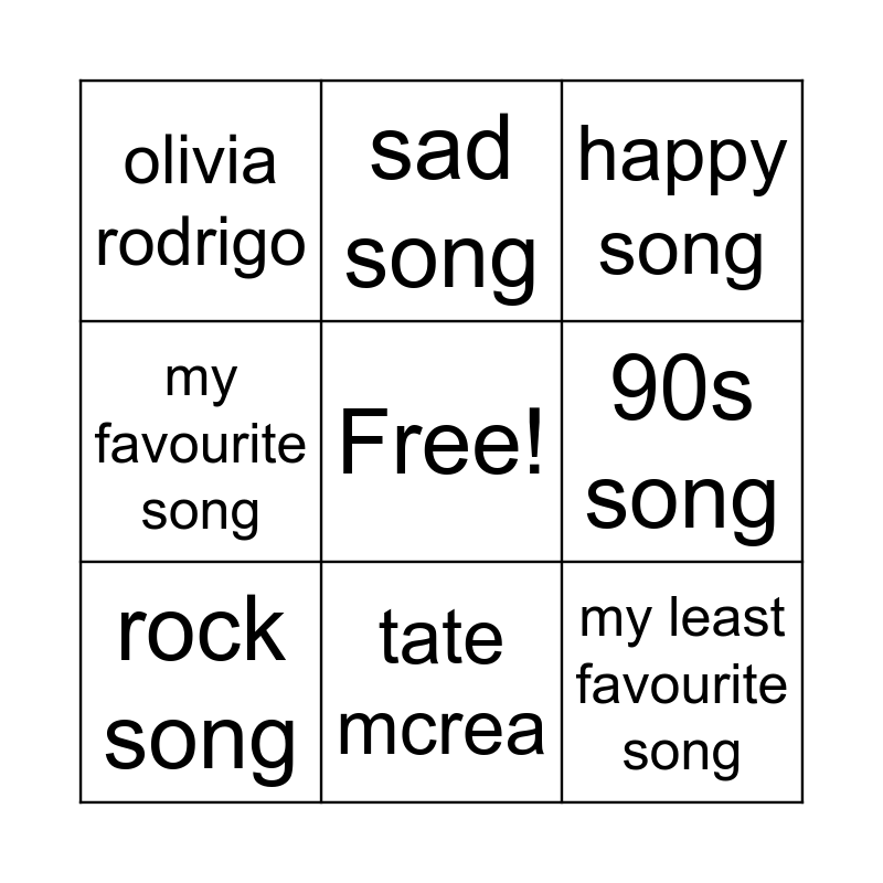 This bingo card has a free space and 8 words: 90s song, happy song, sad song, rock song, olivia rodrigo, my least favourite song, my favourite song and tate mcrea.