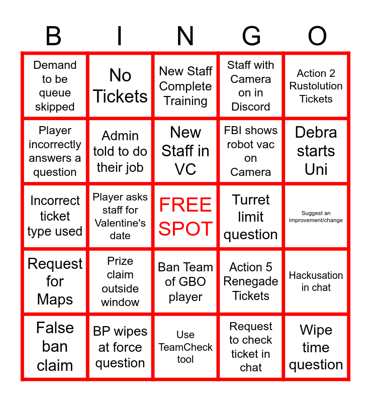 This bingo card has a free space and 24 words: Prize claim outside window, BP wipes at force question, New Staff in VC, False ban claim, Action 2 Rustolution Tickets, Demand to be queue skipped, Player incorrectly answers a question, No Tickets, Turret limit question, Ban Team of GBO player, FBI shows robot vac on Camera, Incorrect ticket type used, Action 5 Renegade Tickets, Hackusation in chat, Admin told to do their job, Request to check ticket in chat, Suggest an improvement/change, New Staff Complete Training, Debra starts Uni, Player asks staff for Valentine's date, Wipe time question, Request for Maps, Staff with Camera on in Discord and Use TeamCheck tool.