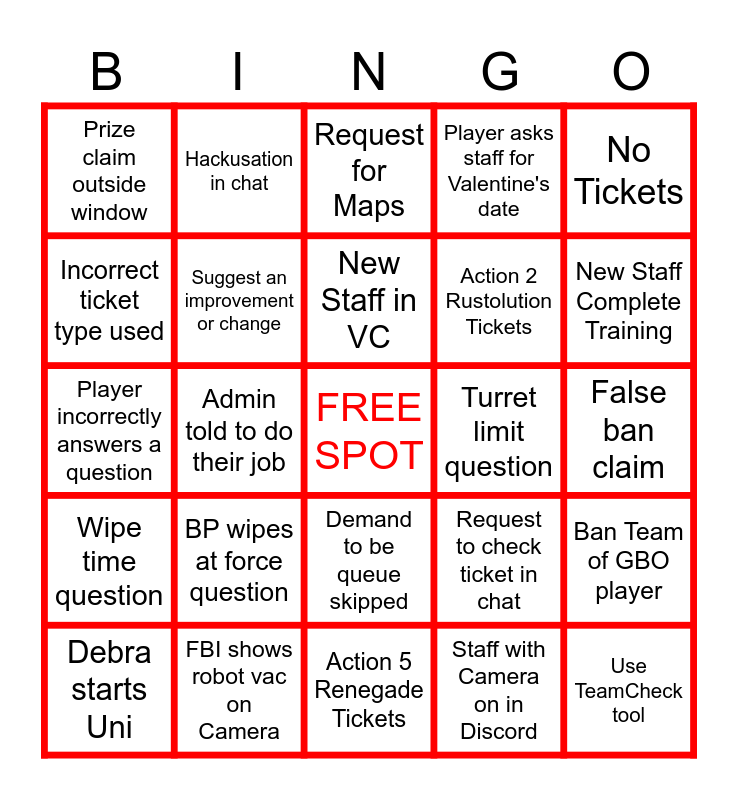 This bingo card has a free space and 24 words: BP wipes at force question, FBI shows robot vac on Camera, New Staff in VC, Debra starts Uni, No Tickets, Prize claim outside window, Incorrect ticket type used, Hackusation in chat, Turret limit question, Demand to be queue skipped, Action 2 Rustolution Tickets, Player incorrectly answers a question, Request to check ticket in chat, Ban Team of GBO player, Suggest an improvement or change, Staff with Camera on in Discord, False ban claim, Request for Maps, New Staff Complete Training, Admin told to do their job, Use TeamCheck tool, Wipe time question, Player asks staff for Valentine's date and Action 5 Renegade Tickets.
