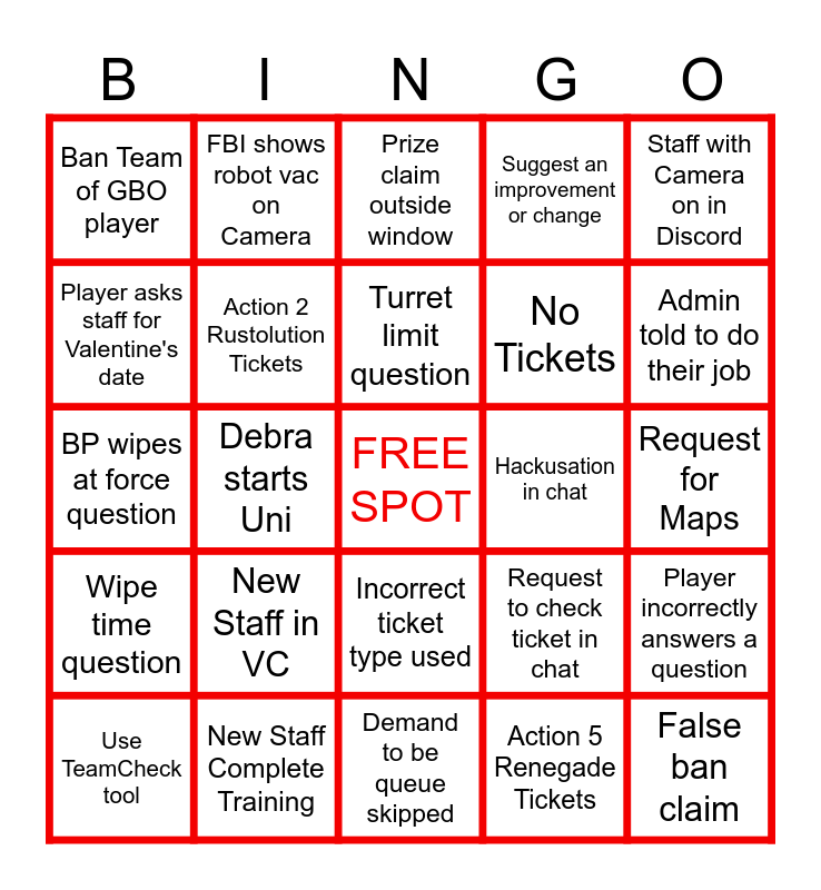 This bingo card has a free space and 24 words: New Staff in VC, New Staff Complete Training, Turret limit question, Use TeamCheck tool, Staff with Camera on in Discord, Ban Team of GBO player, Player asks staff for Valentine's date, FBI shows robot vac on Camera, Hackusation in chat, Incorrect ticket type used, No Tickets, BP wipes at force question, Request to check ticket in chat, Player incorrectly answers a question, Action 2 Rustolution Tickets, Action 5 Renegade Tickets, Request for Maps, Prize claim outside window, Admin told to do their job, Debra starts Uni, False ban claim, Wipe time question, Suggest an improvement or change and Demand to be queue skipped.