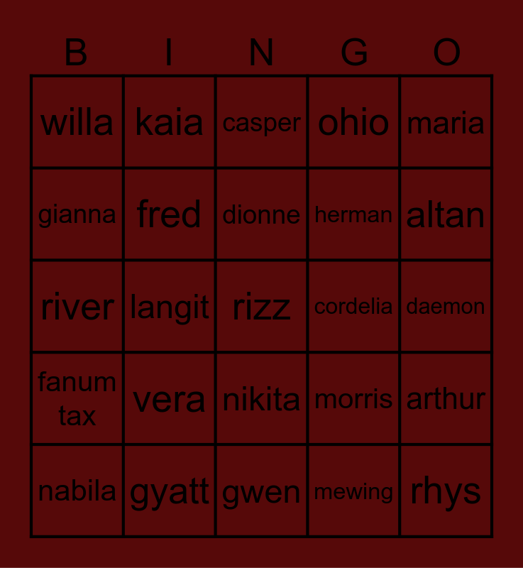 This bingo card has 25 words: vera, gwen, dionne, nabila, maria, willa, gianna, kaia, cordelia, nikita, herman, river, morris, arthur, fred, rhys, daemon, casper, altan, langit, rizz, gyatt, fanum tax, ohio and mewing.