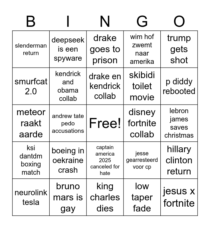 This bingo card has a free space and 24 words: boeing in oekraine crash, bruno mars is gay, drake en kendrick collab, neurolink tesla, trump gets shot, slenderman return, smurfcat 2.0, deepseek is een spyware, disney fortnite collab, captain america 2025 canceled for hate, skibidi toilet movie, meteor raakt aarde, jesse gearresteerd voor cp, hillary clinton return, kendrick and obama collab, low taper fade, lebron james saves christmas, drake goes to prison, p diddy rebooted, andrew tate pedo accusations, jesus x fortnite, ksi dantdm boxing match, wim hof zwemt naar amerika and king charles dies.