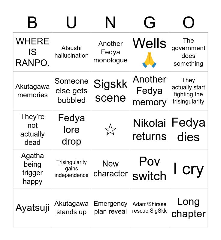 This bingo card has a free space and 24 words: Trisingularity gains independence, Akutagawa stands up, Sigskk scene, Ayatsuji, The government does something, WHERE IS RANPO., Akutagawa memories, Atsushi hallucination, Nikolai returns, New character, Another Fedya memory, They’re not actually dead, Pov switch, I cry, Someone else gets bubbled, Adam/Shirase rescue SigSkk, Fedya dies, Another Fedya monologue, They actually start fighting the trisingularity, Fedya lore drop, Long chapter, Agatha being trigger happy, Wells 🙏 and Emergency plan reveal.