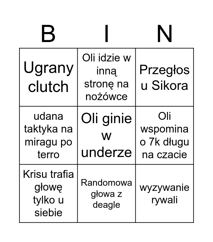 This bingo card has a free space and 9 words: Krisu trafia głowę tylko u siebie, Przegłos u Sikora, Oli idzie w inną stronę na nożówce, udana taktyka na miragu po terro, Ugrany clutch, Oli wspomina o 7k długu na czacie, wyzywanie rywali, Randomowa głowa z deagle and Randomowa głowa z deagle.