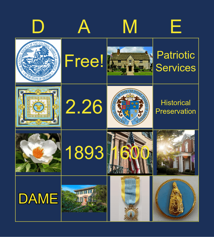 This bingo card has 11 images and 9 words: 1600, Free!, 1893, 2.26, DAME, 17, Patriotic Services, Historical Preservation and Education.