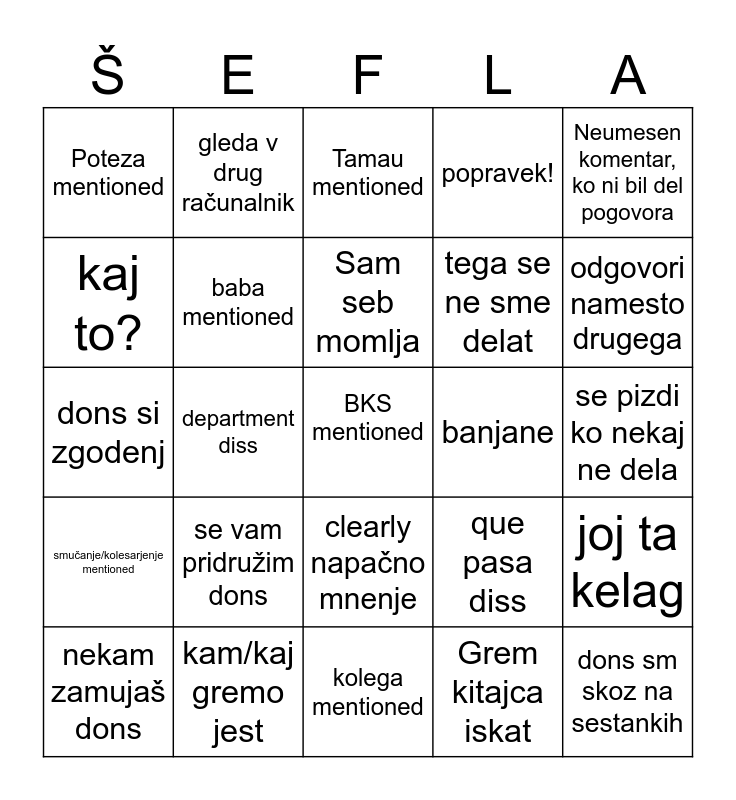 This bingo card has a free space and 24 words: nekam zamujaš dons, se vam pridružim dons, Sam seb momlja, Grem kitajca iskat, Neumesen komentar, ko ni bil del pogovora, Poteza mentioned, gleda v drug računalnik, Tamau mentioned, banjane, se pizdi ko nekaj ne dela, dons si zgodenj, baba mentioned, que pasa diss, joj ta kelag, kaj to?, kam/kaj gremo jest, kolega mentioned, popravek!, odgovori namesto drugega, smučanje/kolesarjenje mentioned, department diss, clearly napačno mnenje, tega se ne sme delat and dons sm skoz na sestankih.