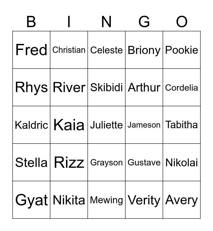 This bingo card has 25 words: Rizz, Mewing, Skibidi, Gyat, Pookie, Fred, Rhys, Christian, Jameson, Grayson, Arthur, Kaldric, Gustave, Nikolai, River, Avery, Tabitha, Celeste, Cordelia, Kaia, Juliette, Nikita, Stella, Briony and Verity.
