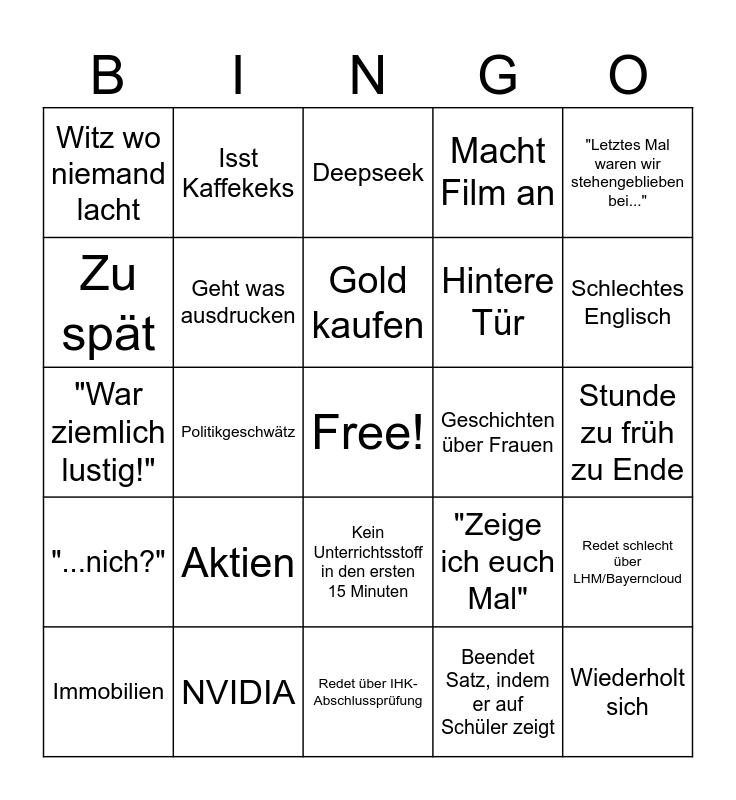 This bingo card has a free space and 24 words: Aktien, NVIDIA, Gold kaufen, Immobilien, "Letztes Mal waren wir stehengeblieben bei...", Witz wo niemand lacht, Zu spät, Isst Kaffekeks, Geschichten über Frauen, Kein Unterrichtsstoff in den ersten 15 Minuten, Hintere Tür, "War ziemlich lustig!", "Zeige ich euch Mal", Redet schlecht über LHM/Bayerncloud, Geht was ausdrucken, Beendet Satz, indem er auf Schüler zeigt, Stunde zu früh zu Ende, Deepseek, Schlechtes Englisch, Politikgeschwätz, Wiederholt sich, "...nich?", Macht Film an and Redet über IHK-Abschlussprüfung.