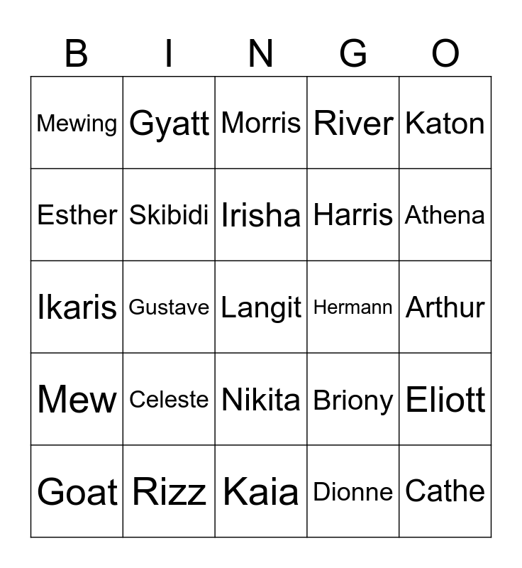 This bingo card has 25 words: Celeste, Kaia, Irisha, Goat, Katon, Mewing, Esther, Gyatt, Hermann, Nikita, Harris, Ikaris, Briony, Eliott, Skibidi, Cathe, Arthur, Morris, Athena, Gustave, Langit, Rizz, Mew, River and Dionne.
