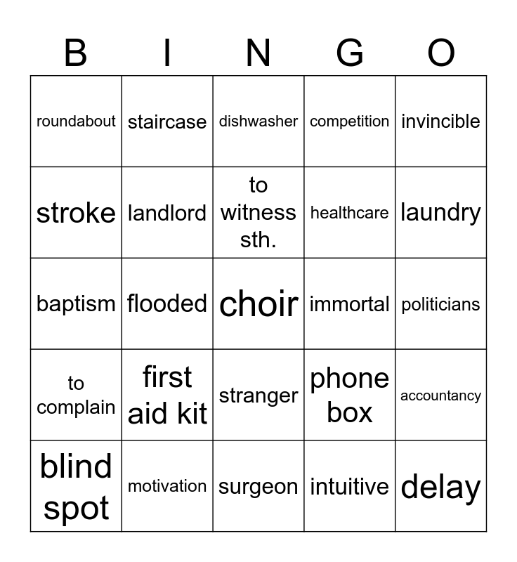 This bingo card has a free space and 24 words: first aid kit, motivation, to witness sth., blind spot, invincible, roundabout, stroke, staircase, immortal, stranger, healthcare, baptism, phone box, accountancy, landlord, intuitive, politicians, dishwasher, laundry, flooded, delay, to complain, competition and surgeon.