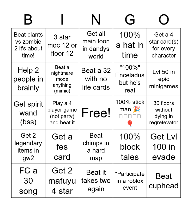 This bingo card has a free space and 24 words: Get a fes card, Get 2 mafuyu 4 star, Beat a 32 with no life cards, FC a 30 song, Get a 4 star card(s) for every character, Beat plants vs zombie 2 it's about time!, Help 2 people in brainly, 3 star moc 12 or floor 12, 100% stick man ππΏπ°π π π π, Beat chimps in a hard map, "100%" Enceladus but he's real, Get spirit wand (bss), 100% block tales, Get Lvl 100 in evade, Beat a nightmare mode anything (mimic), "Participate in a roblox event, 30 floors without dying in regretevator, Get all main toon in dandys world, Lvl 50 in epic minigames, Play a 4 player game (not party) and beat it, Beat cuphead, Get 2 legendary items in gw2, 100% a hat in time and Beat it takes two again.