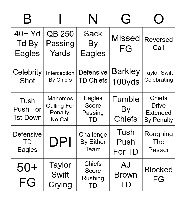 This bingo card has 25 words: DPI, Chiefs Score Rushing TD, Defensive TD Chiefs, 50+ FG, Reversed Call, 40+ Yd Td By Eagles, Celebrity Shot, QB 250 Passing Yards, Fumble By Chiefs, Challenge By Either Team, Barkley 100yds, Tush Push For 1st Down, Tush Push For TD, Roughing The Passer, Interception By Chiefs, Blocked FG, Chiefs Drive Extended By Penalty, Sack By Eagles, Taylor Swift Celebrating, Mahomes Calling For Penalty, No Call, Eagles Score Passing TD, Taylor Swift Crying, Defensive TD Eagles, Missed FG and AJ Brown TD.