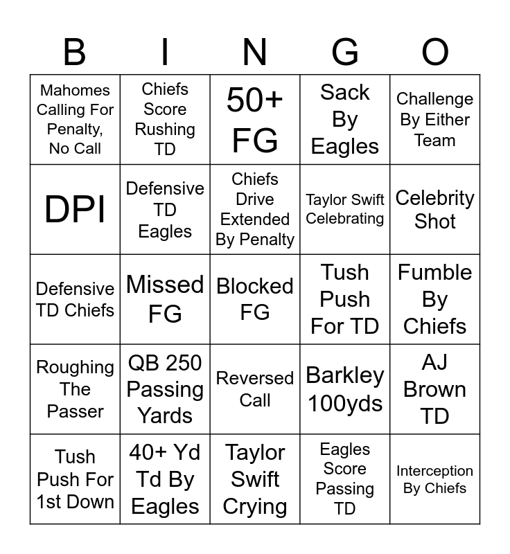 This bingo card has 25 words: QB 250 Passing Yards, Taylor Swift Crying, Chiefs Drive Extended By Penalty, Tush Push For 1st Down, Challenge By Either Team, Mahomes Calling For Penalty, No Call, DPI, Chiefs Score Rushing TD, Tush Push For TD, Reversed Call, Taylor Swift Celebrating, Defensive TD Chiefs, Barkley 100yds, AJ Brown TD, Defensive TD Eagles, Interception By Chiefs, Fumble By Chiefs, 50+ FG, Celebrity Shot, Missed FG, Blocked FG, 40+ Yd Td By Eagles, Roughing The Passer, Sack By Eagles and Eagles Score Passing TD.