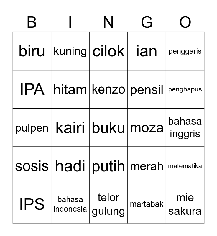 This bingo card has a free space and 24 words: hadi, bahasa indonesia, kenzo, IPS, penggaris, biru, IPA, kuning, moza, putih, pensil, pulpen, merah, matematika, hitam, martabak, bahasa inggris, cilok, penghapus, kairi, mie sakura, sosis, ian and telor gulung.