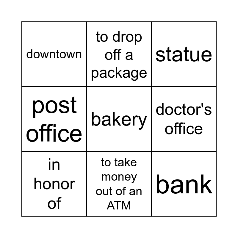 This bingo card has 29 words: colonial architecture, modern architecture, neighborhood, cathedral, downtown, statue, in honor of, monument, small town, butcher shop, shopping center/mall, gas station, pharmacy, hardware store, church, temple, mosque, jewelry store, bakery, pastry shop, fish market, shoe store, bank, doctor's office, post office, to drop off a package, to send a letter by mail, to take money out of an ATM and to watch a film/movie.