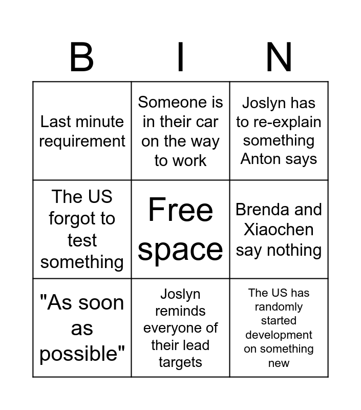 This bingo card has a free space and 8 words: Brenda and Xiaochen say nothing, Joslyn has to re-explain something Anton says, Someone is in their car on the way to work, "As soon as possible", Last minute requirement, The US has randomly started development on something new, The US forgot to test something and Joslyn reminds everyone of their lead targets.