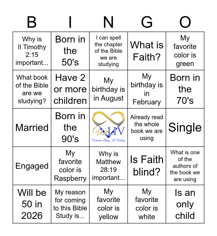 This bingo card has a free space and 24 words: My favorite color is Raspberry, My reason for coming to this Bible Study is..., My birthday is in August, Will be 50 in 2026, My favorite color is green, Why is II Timothy 2:15 important..., What book of the Bible are we studying?, Born in the 50's, Already read the whole book we are using, Why is Matthew 28:19 important..., My birthday is in February, Married, Is Faith blind?, What is one of the authors of the book we are using, Have 2 or more children, My favorite color is white, Single, I can spell the chapter of the Bible we are studying, Born in the 70's, Born in the 90's, Is an only child, Engaged, What is Faith? and My favorite color is yellow.