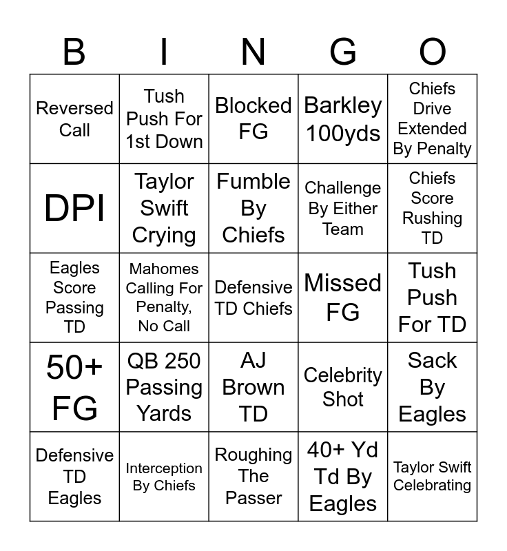 This bingo card has 25 words: QB 250 Passing Yards, Roughing The Passer, Fumble By Chiefs, Defensive TD Eagles, Chiefs Drive Extended By Penalty, Reversed Call, DPI, Tush Push For 1st Down, Missed FG, AJ Brown TD, Challenge By Either Team, Eagles Score Passing TD, Celebrity Shot, Sack By Eagles, Taylor Swift Crying, Taylor Swift Celebrating, Tush Push For TD, Blocked FG, Chiefs Score Rushing TD, Mahomes Calling For Penalty, No Call, Defensive TD Chiefs, Interception By Chiefs, 50+ FG, Barkley 100yds and 40+ Yd Td By Eagles.